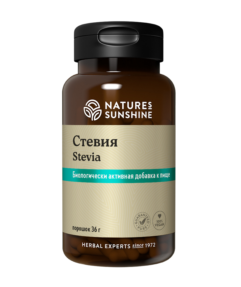 Стевия медовая (Stevia rebaudiana) – многолетний кустарник, родиной которого являются Бразилия и Парагвай. Индейцы вот уже 1500 лет употребляют ее в пищу. В середине ХХ века из стевии были выделены активные ингредиенты – гликозиды (стевиозид, ребаудиазид и др.), которые в 300 раз слаще обычного сахара и при этом имеют нулевую калорийность. Кроме сладких гликозидов, в состав стевии входит много других полезных веществ: антиоксиданты – флавоноиды (рутин, кверцетин), витамины. Стевия нормализует уровень сахара в крови и рекомендуется при нарушении обмена веществ, сахарном диабете, атеросклерозе, нарушении жирового обмена. Стевия улучшает работу сердечно-сосудистой и иммунной систем, щитовидной железы, печени, нормализует давление, обладает антиоксидантным, адаптогенным, противовоспалительным действием. При регулярном употреблении стевии снижается содержание глюкозы в крови и вязкость крови. Она безвредна при длительном употреблении, в отличие от синтетических заменителей сахара (сахарина, ацесульфата, аспартама и др.). Стевиозиды подавляют развитие многих микроорганизмов, защищают зубы от кариеса, а десны от парадонтоза. За рубежом выпускают зубные пасты и жевательные резинки со стевиозидом. В состав зубных паст NSP Саншайн Брайт также входит стевия.